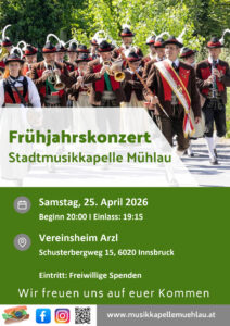 Die Stadtmusikkapelle Mühlau lädt euch zum traditoniellen Frühjahrskonzert unter der Leitung von Kapellmeister Thomas Rampl am 25. April 2025 ein.